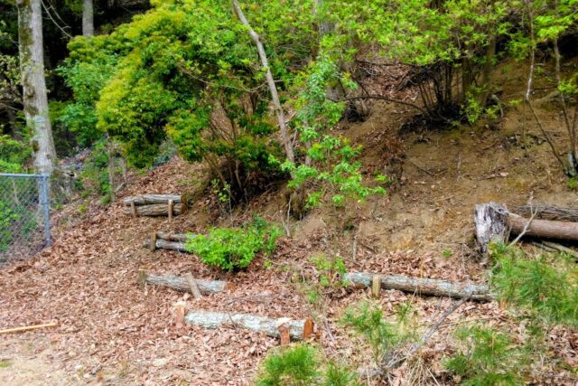 急勾配な斜面の土が流され斜面崩壊が懸念されるので回収した倒木材などで 土留め作業を行いました。