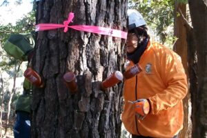 マツ枯れ予防の薬注を行いました 2026/01/13 32本のマツに薬注を行いました 1/12(祝)極寒のなか森林グループは8人でオオタカの森へ入り薬中を行いました。 薬剤の注入具合を確認するため1週間後に再度山へ入ります。 https://www.t-moric.info/struct/wp-content/uploads/80ede48813335a4b11d9d9598a9113b9.mp4 対象マツの1本 薬中マツの分布 持込薬剤など ドリルで穴開け 薬剤の注入 薬剤の注入