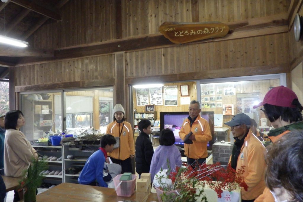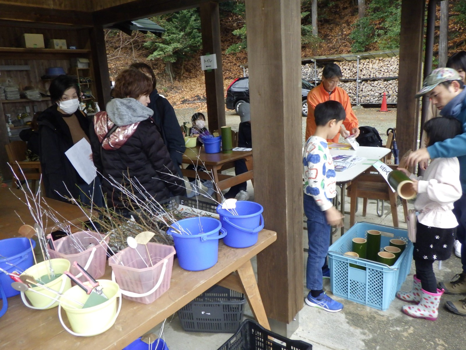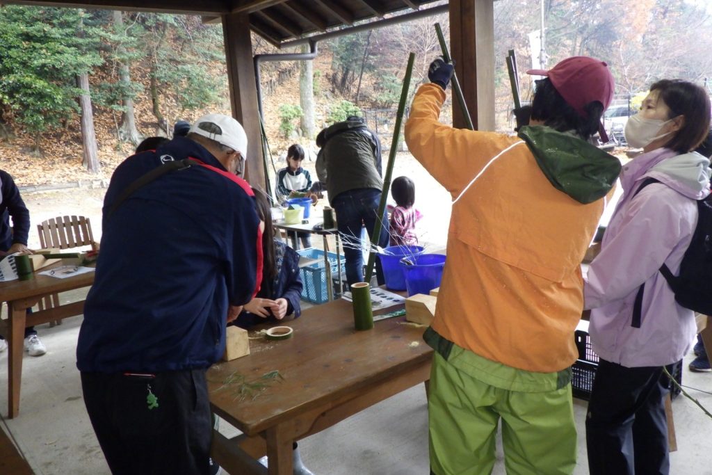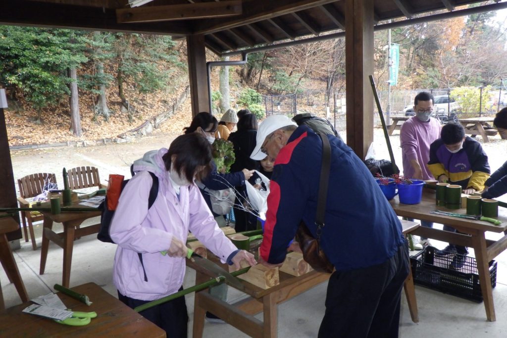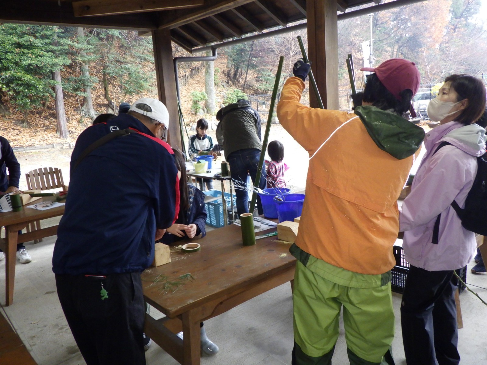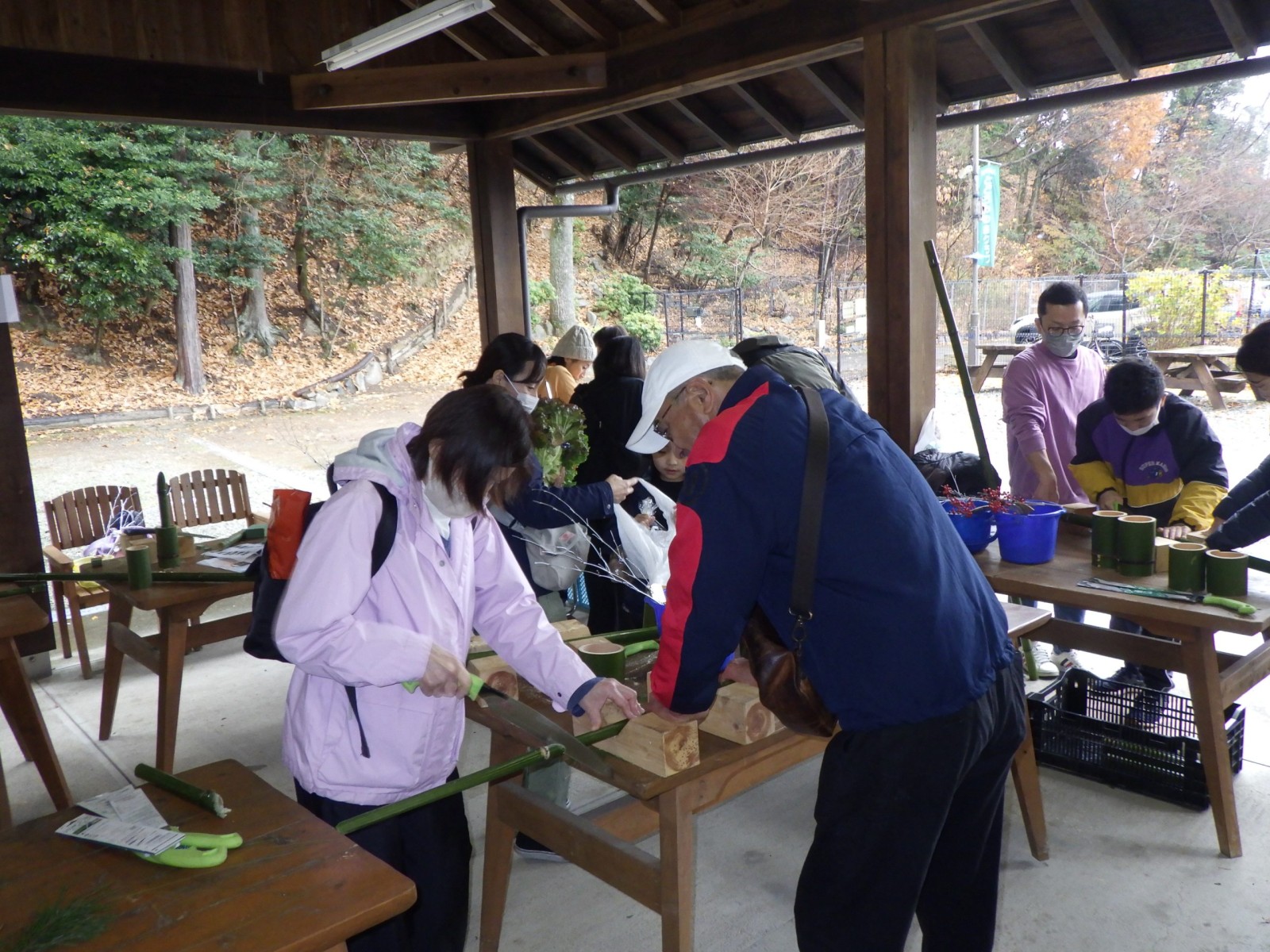 12月21日(日)あいにくの雨の天気でしたが、「里山の竹「孟宗竹」・松の葉・菜園の南天などを使い」地域の皆様・クラブ会員含め 52名が集い松飾づくりを行いました、まず大きな竹を各自のかざりつけの松飾りの長さに竹ノコギリで切断し、そして、中に入れる小さな竹を切り作っていきます。昨日、会員が、今日の参加者がつくれるよう動画作成した映像を見て確認しながら、それぞれの思いを込め新年を迎えるための飾りつけをして作っていきました。