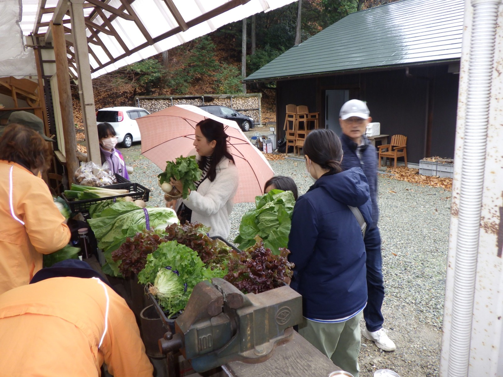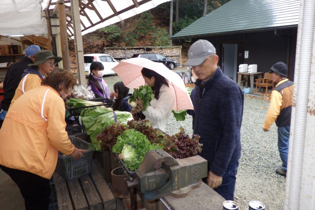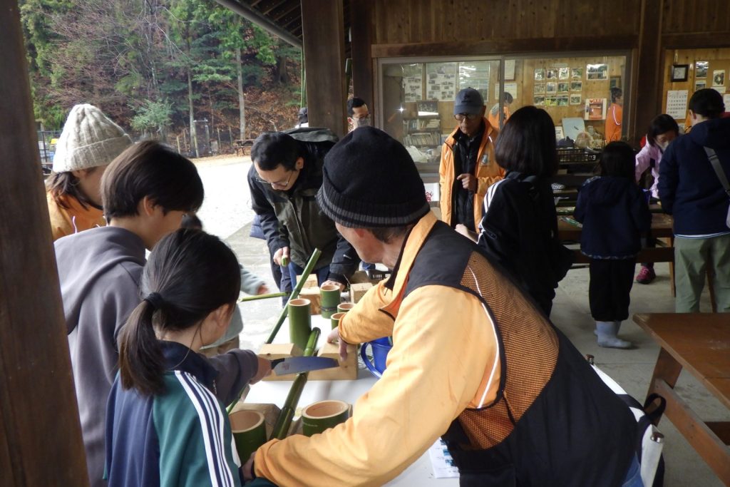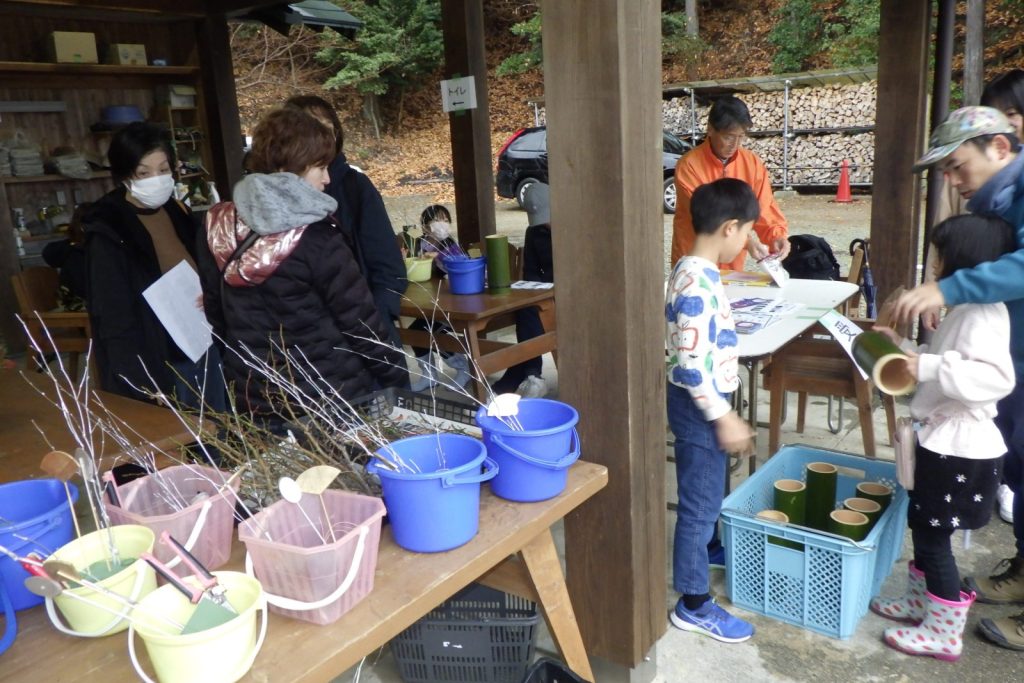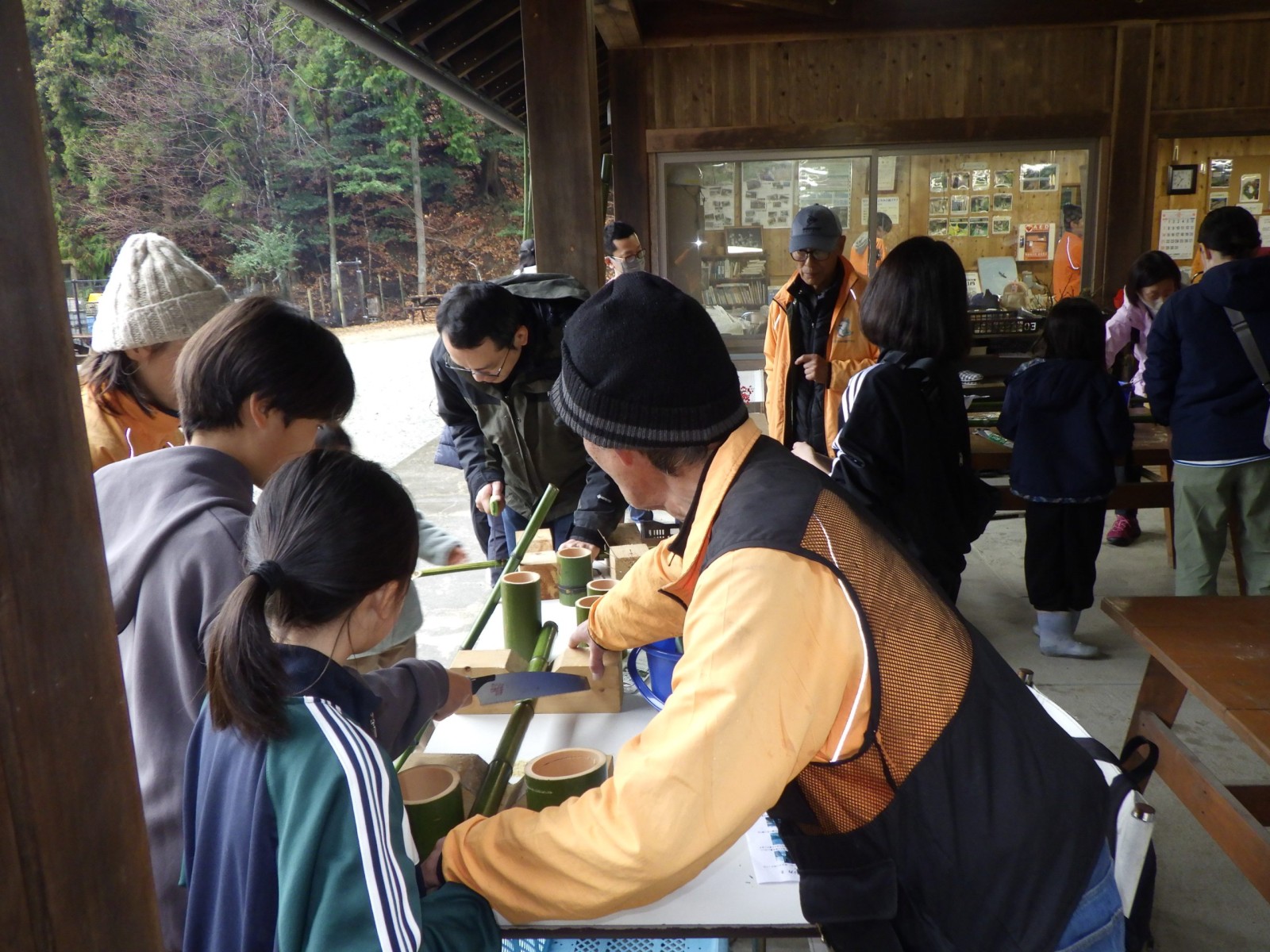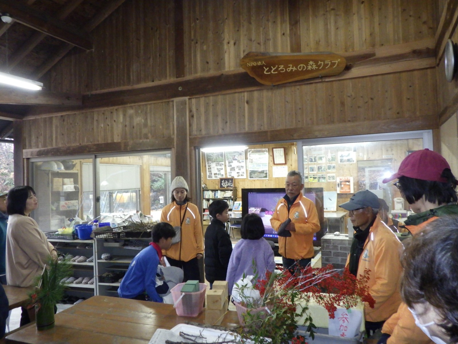 12月21日(日)あいにくの雨の天気でしたが、「里山の竹「孟宗竹」・松の葉・菜園の南天などを使い」地域の皆様・クラブ会員含め 52名が集い松飾づくりを行いました、まず大きな竹を各自のかざりつけの松飾りの長さに竹ノコギリで切断し、そして、中に入れる小さな竹を切り作っていきます。昨日、会員が、今日の参加者がつくれるよう動画作成した映像を見て確認しながら、それぞれの思いを込め新年を迎えるための飾りつけをして作っていきました。