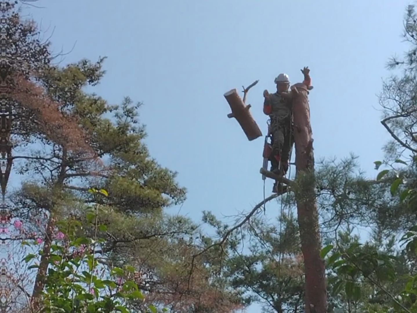 鹿対策ネット内の枯れマツ伐倒