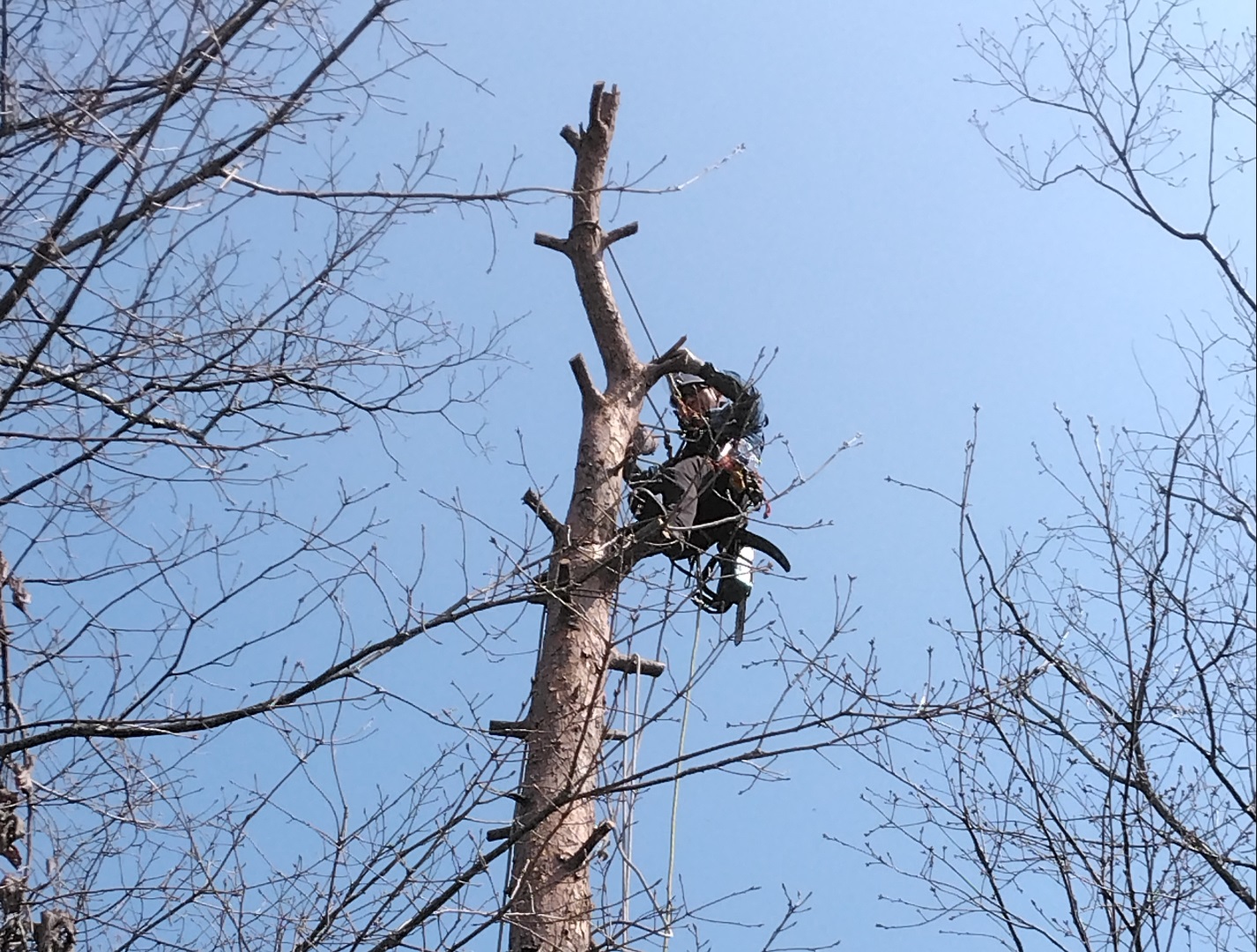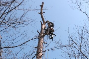 鹿対策ネット内の枯れマツ伐倒