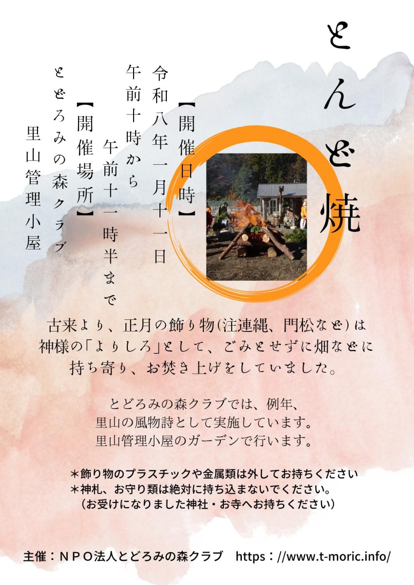 1月11日(日) とんど焼き 2025/12/14 とんど焼 1月11日(日) 午前10時 点火 午前11時半 終了 場所 とどろみの森クラブ 敷地内 正月飾りや書初めなど燃やせるものをお持ちください (神札やお守りはお受けできません)